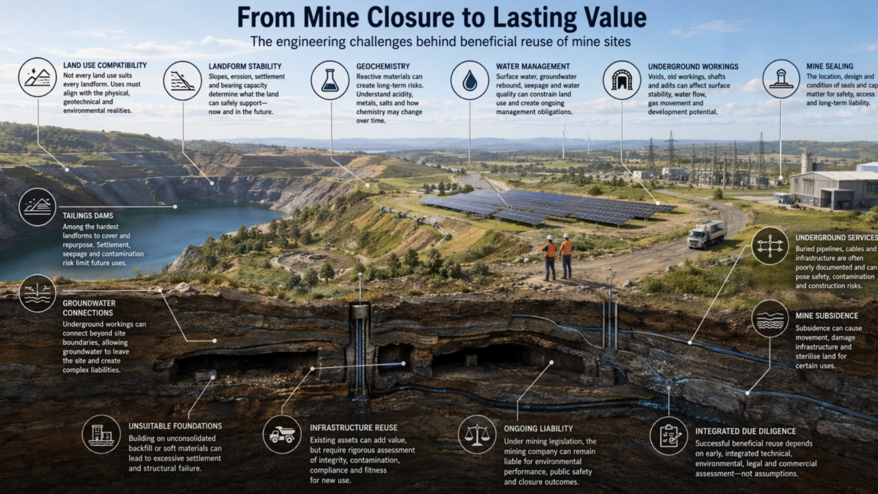 For future developers, that creates an important tension. A beneficial reuse concept may look commercially attractive, but the mining company must still consider whether that use disturbs engineered closure controls, increases public exposure, changes drainage behaviour, interacts with subsidence zones or reactivates previously managed risks.